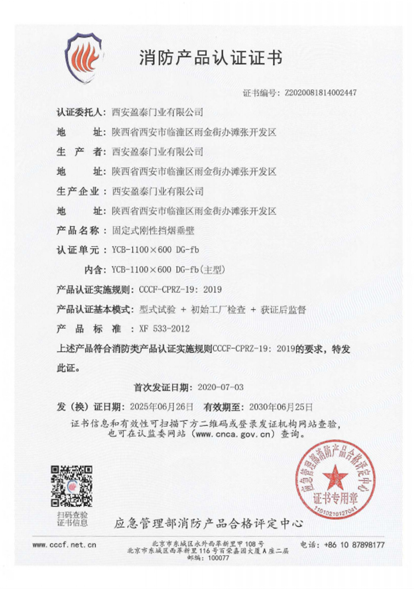 固定式刚性挡烟垂壁DG-fb 消防产品认证证书