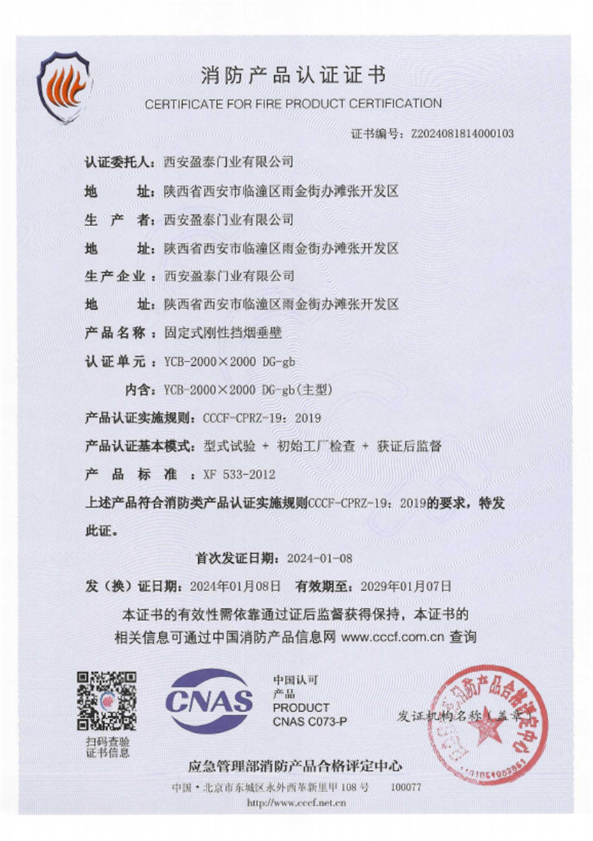 固定式刚性挡烟垂壁DG-gb 消防产品认证证书